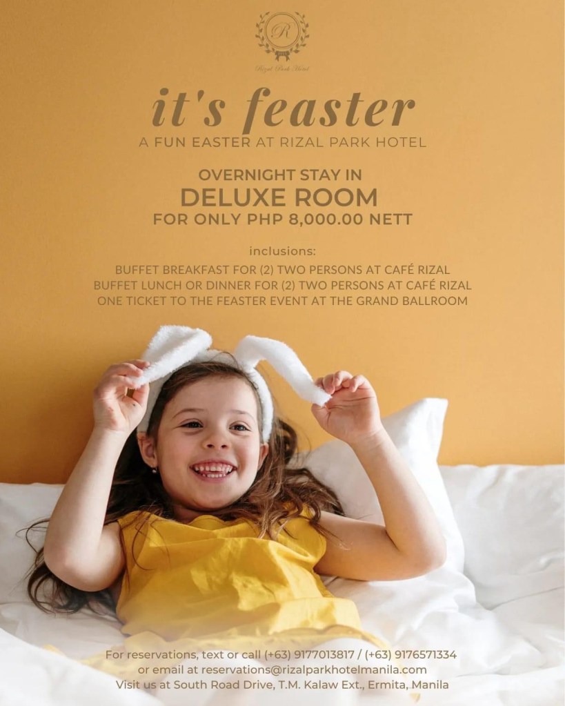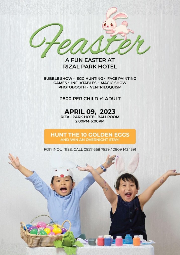Prepare for a fun-filled easter as Rizal Park Hotel once again opens its ballroom doors on April 09 to celebrate a Feaster: A Fun Easter at Rizal Park Hotel. For only P800, kids and kids at heart can enjoy a day of exciting activities other than the usual easter egg hunt. The ticket covers 1 kid ages 0-12 and 1 adult companion, inclusive of a lootbag and access to the program, which starts at 2 PM until 6 PM. Expect an array of easter-themed games, a magic show, bubble show, ventriloquism, face painting, a photobooth, and child-safe inflatables.