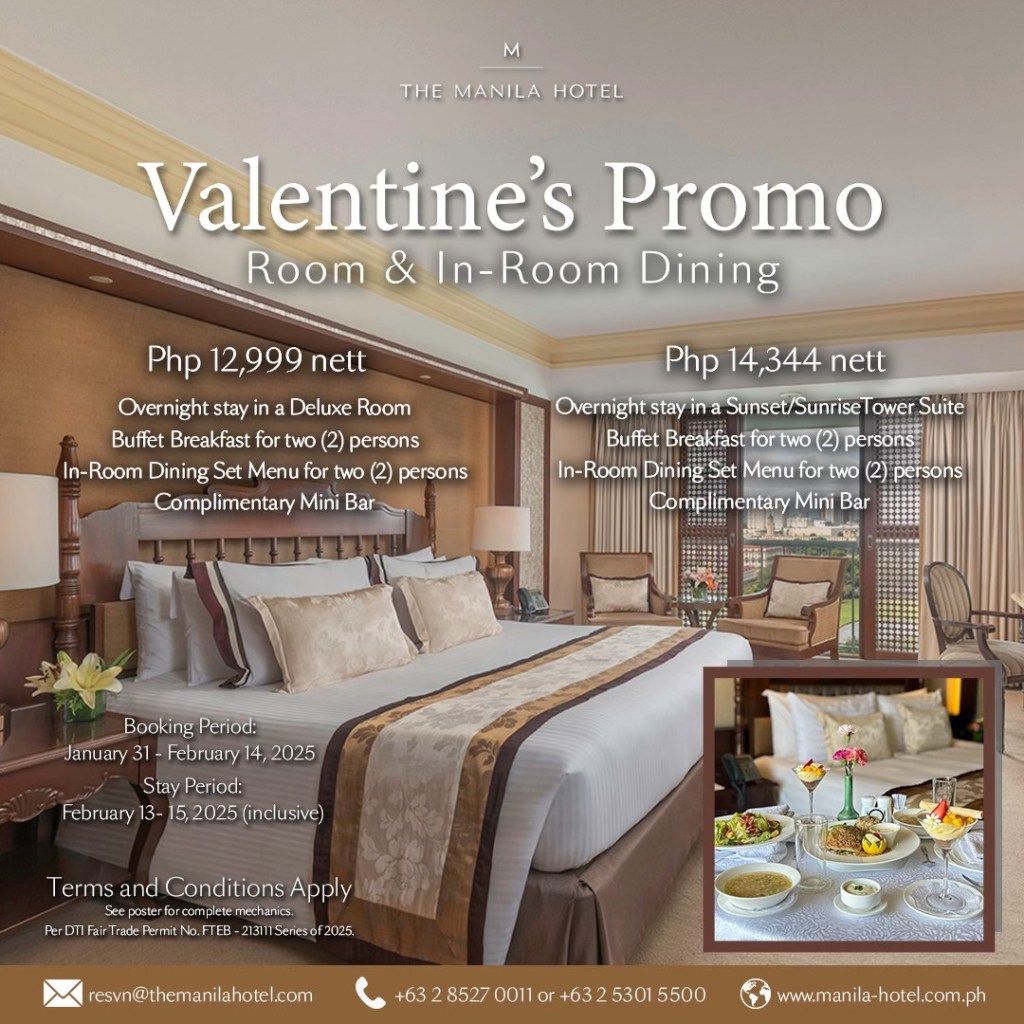 The Manila Hotel offers a Valentine’s Staycation package, inclusive of an overnight stay and an intimate in-room dining experience for two. Guests can choose between a Deluxe Room at Php 12,999 nett or a One-Bedroom Suite at Php 14,344 nett. Both options include breakfast for two, a specially prepared in-room dining set menu, and a complimentary mini bar. The in-room dining set menu features Pacific Rim Caesar Salad with Shrimps, Cream of Pumpkin-Carrot Soup, Fettucine in Cherry Tomato Cream with Fresh Basil, Roast U.S. Beef Tenderloin, Strawberry Eclairs, and Pink French Macarons. This offer is available for booking until February 14, 2025, with a stay period from February 13 to 15, 2025. Per DTI Fair Trade Permit No. FTEB-21311 Series of 2025.