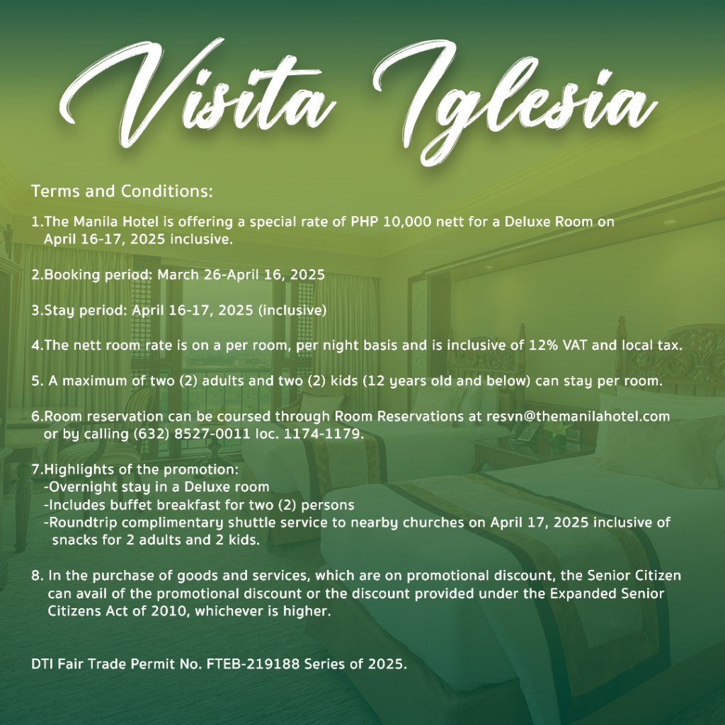 For a complete Holy Week retreat, guests can avail the Visita Iglesia Room Offer at Php 10,000 per room per night, which includes a stay in a Deluxe Room, breakfast for two at Café Ilang-Ilang, and Visita Iglesia tour access for two adults and two kids. Reservations are open until April 16, 2025 through +6328527 0011 or resvn@themanilahotel.com, with stay dates from April 16 to 18, 2025 inclusive.