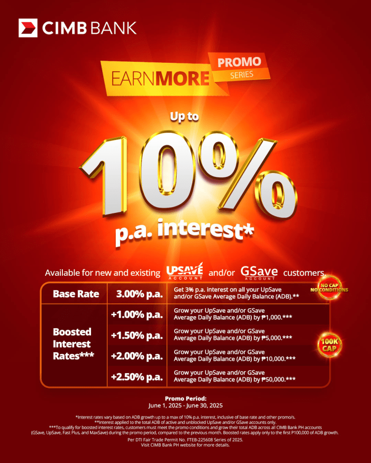 Take your midyear savings to even greater heights as CIMB Bank Philippines, the Best Digital Bank in the country according to The Asian Banker, continues its high interest offerings as part of its Earn More promo series. From June 1 to 30, 2025, qualified customers can enjoy a boosted interest rate and earn up to 10% interest per annum (p.a.) with CIMB.