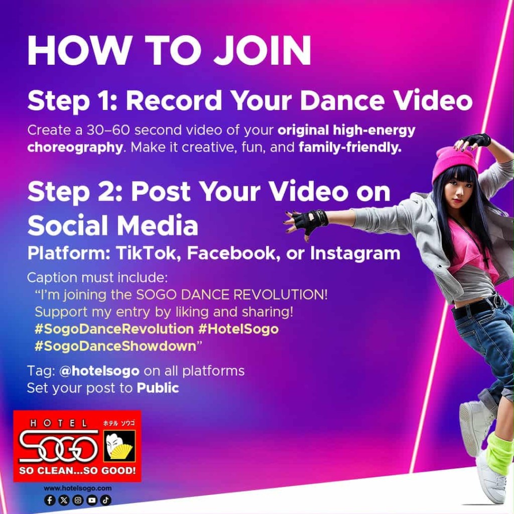 “We want to highlight the real dance talent of the Filipino people—those who bring energy, rhythm, and positive spirit wherever they go,” said by Ms. Sue Geminiano, Hotel Sogo Marketing Manager. “This contest allows groups to bond, express themselves, and possibly win big while doing something they love.