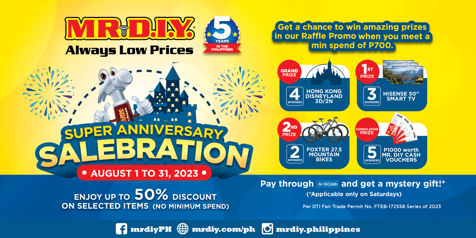 Five years of DIY excellence calls for a celebration like no other! MR.DIY, the leading one-stop shop for everyday needs, is thrilled to announce its 5th-anniversary milestone in the Philippines. To commemorate this, MR.DIY presents the Super Anniversary Salebration—a month-long shopping extravaganza featuring unbeatable discounts, exciting promotions, and a golden opportunity to win fabulous prizes,ContinueContinue reading “SALEBRATE with MR.DIY: Get up to 50% off deals and a Chance to Win a Trip to Hong Kong Disneyland!”